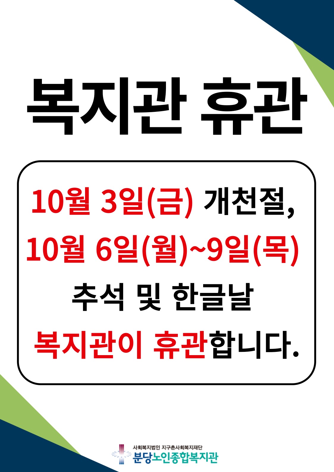[운영지원] 복지관 휴관안내(10/3(금) 개천절, 10/6(월)~10/9(목) 추석 및 한글날)