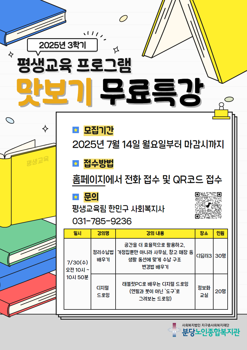 안녕하세요 평생교육팀입니다!2025년 3학기 프로그램 수강신청을 진행하기 전신규 프로그램을 미리 경험해보고관심을 가질 수 있도록 맛보기 특강을 준비했습니다!다양한 프로그램을 무료로 준비했으니어르신들의 많은 관심과 신청 부탁드립니다!신청일시 : 7/14(월) 오전 10시부터 선착순 마감시까지신청방법 : 전화 및 온라인 접수(내방가능)★ 맛보기 특강 신청 바로가기 ★*무료 강의 및 프로그램의 경우 신청 후 사유없이 무단 불참 2회 이상 확인시다음 무료 강의 및 프로그램 신청이 제한 및 취소될 수 있습니다.문의가 있으실 경우 아래의 번호로 연락주세요 감사합니다!문의 : 평생교육팀 한민구 사회복지사(031-785-9236)