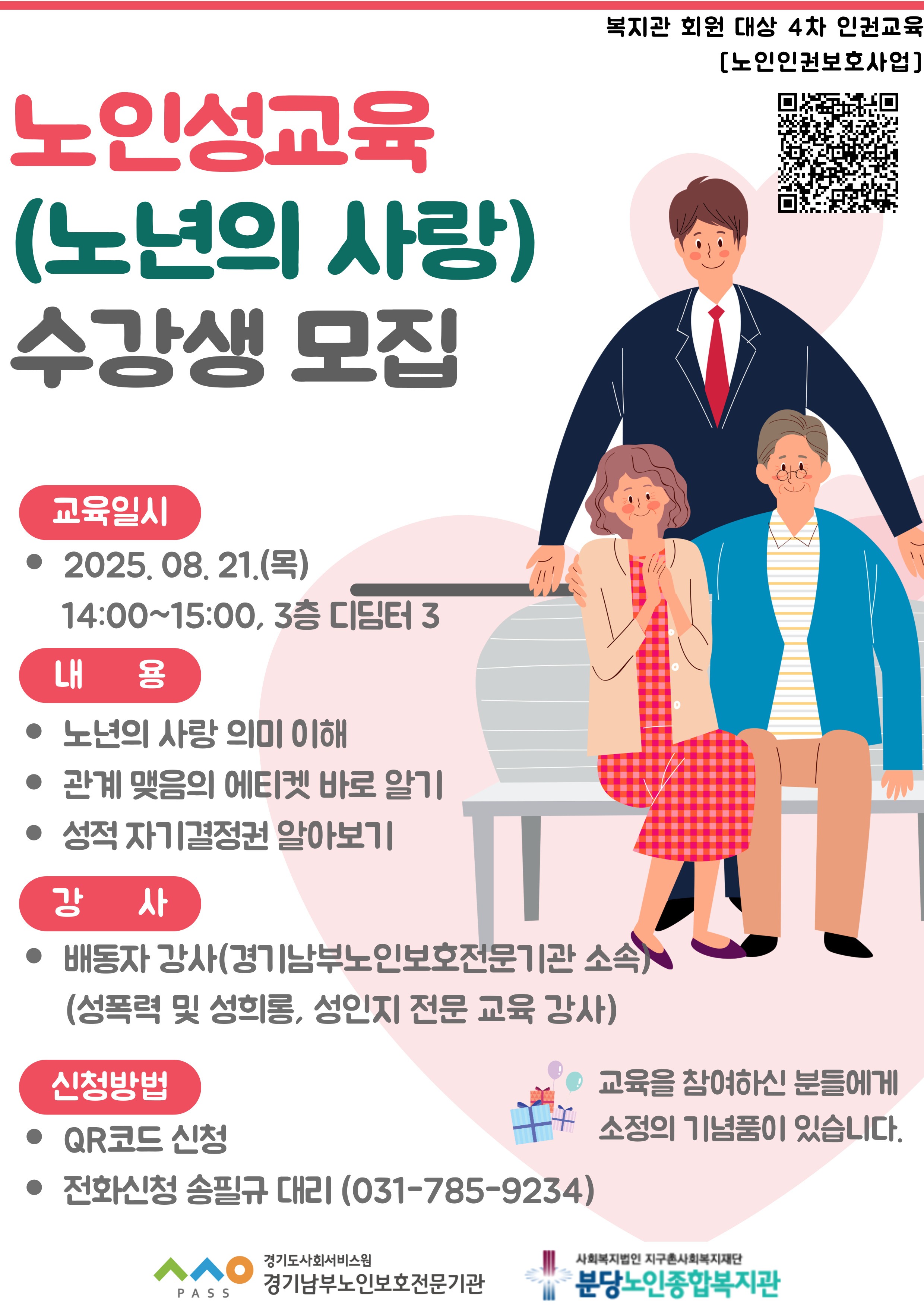 교육일시: 2025.08.21(목) 14:00~15:00 교육장소: 복지관 3층 디딤터3 교육강사: 배동자 강사(경기남부노인보호전문기관 연계) 교육내용: 노년의 사랑 의미 이해, 관계 맺음의 에티켓 바로알기, 성적 자기결정권 알아보기 등 신청방법: QR코드 접속 또는 아래의 신청하기 버튼 클릭, 전화신청, 내방신청 교육대상: 노년의사랑 인권교육 수강을 희망하는 복지관 회원 50명 (교육 종료 후 만족도조사 진행 시 소정의 기념품을 드립니다.) 문의방법: 평생교육팀 송필규 대리(031-785-9234)