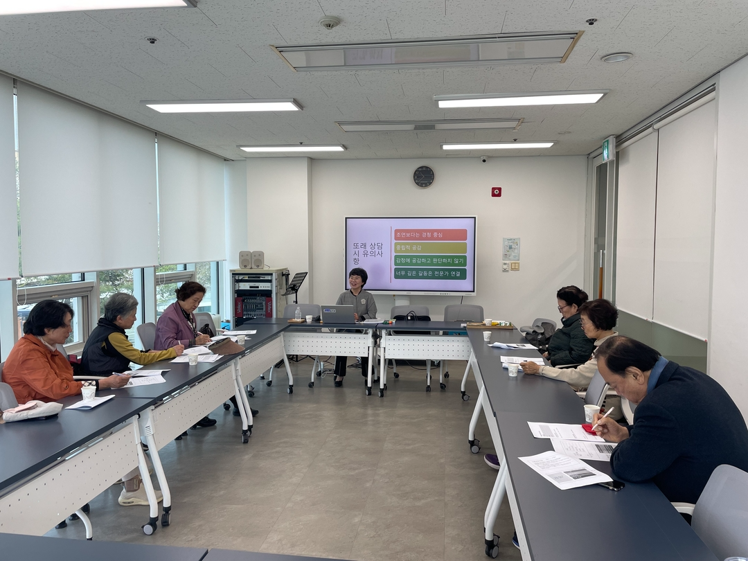 2025. 04. 17(목) 또래상담 봉사활동을 참여해주시는 상담사 선생님들을 대상으로 '가족상담 기법'에 대한 주제로 상담사 전문역량강화교육을 진행하였습니다. 당일 교육은 가족상담기법 관련하여 상담 강의 경험이 풍부하신 김순덕 강사님을 모시고 진행하였습니다. 가족상담과 관련한 이론적 지식과 기술습득 뿐 아니라 다양한 노인상담 사례들을 살펴보고 내담자의 입장에 대해 공감하며 상담의 질을 높이기 위한 교육을 진행하였습니다. 다음주에 진행되는 전문역량강화교육도 많은 참여 부탁드리겠습니다! :)