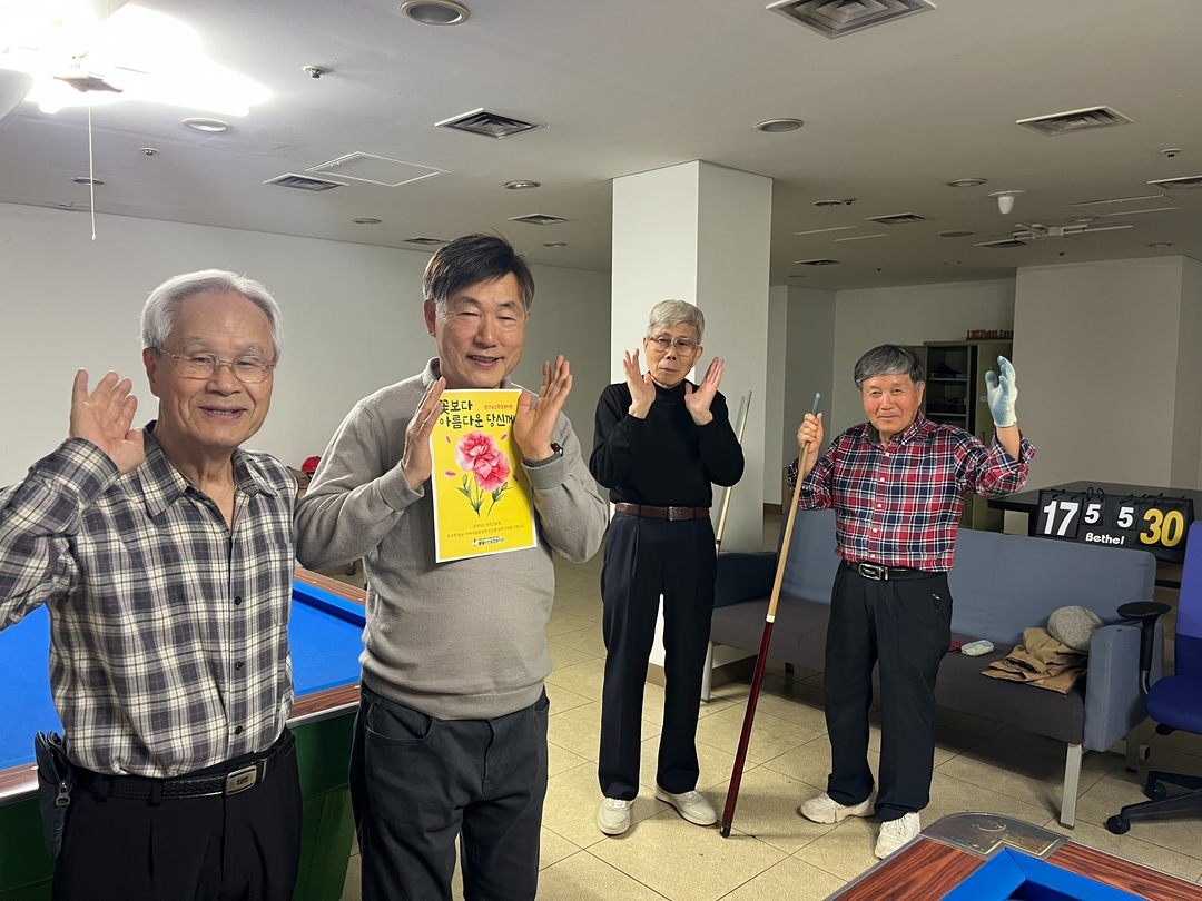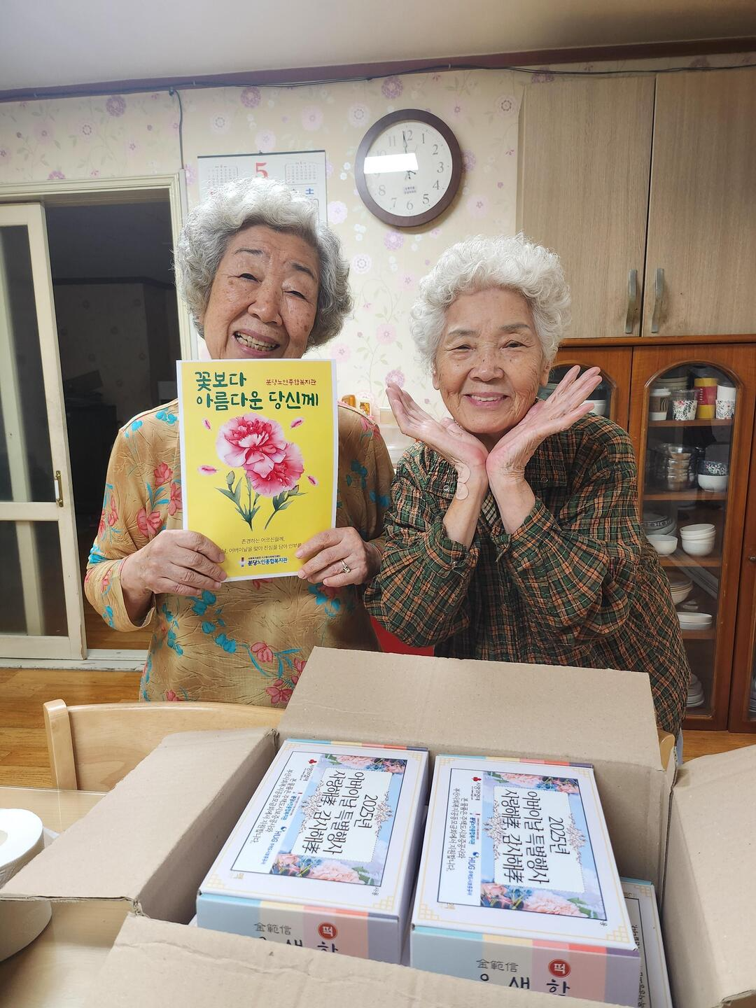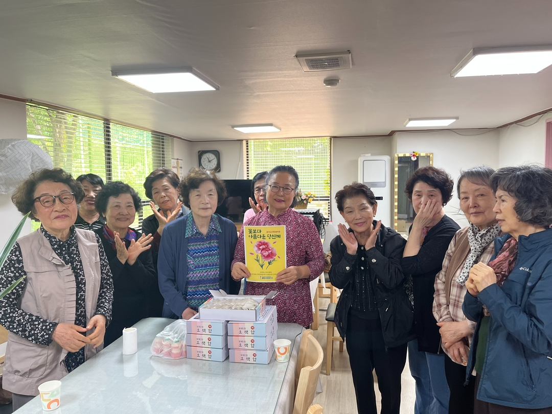 안녕하세요. 경로당활성화사업 담당자입니다.분당노인종합복지관에서는 5월 7일(수)부터 5월 9일(금)까지 어버이날을 맞이하여'경로당 이용 어르신의 정서적 지지를 위한 기념행사 '사랑해孝, 감사해孝'를 진행하였습니다.이번 행사는 지역사회 경로당 활성화사업의 일환으로 총 42개소 경로당에 떡 280세트와 안부서신을 전달하였습니다.떡 세트는 따뜻한 마음을 담아 준비하였고,안부서신은 어르신 한 분 한 분께 감사와 존경의 마음을 전하고자 정성껏 작성하였습니다.어버이날이라는 뜻깊은 날에 지역의 어르신들께 선물을 드릴 수 있어 행복했습니다.